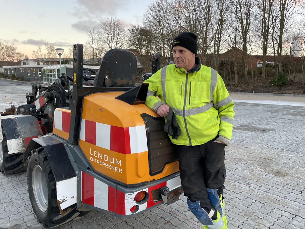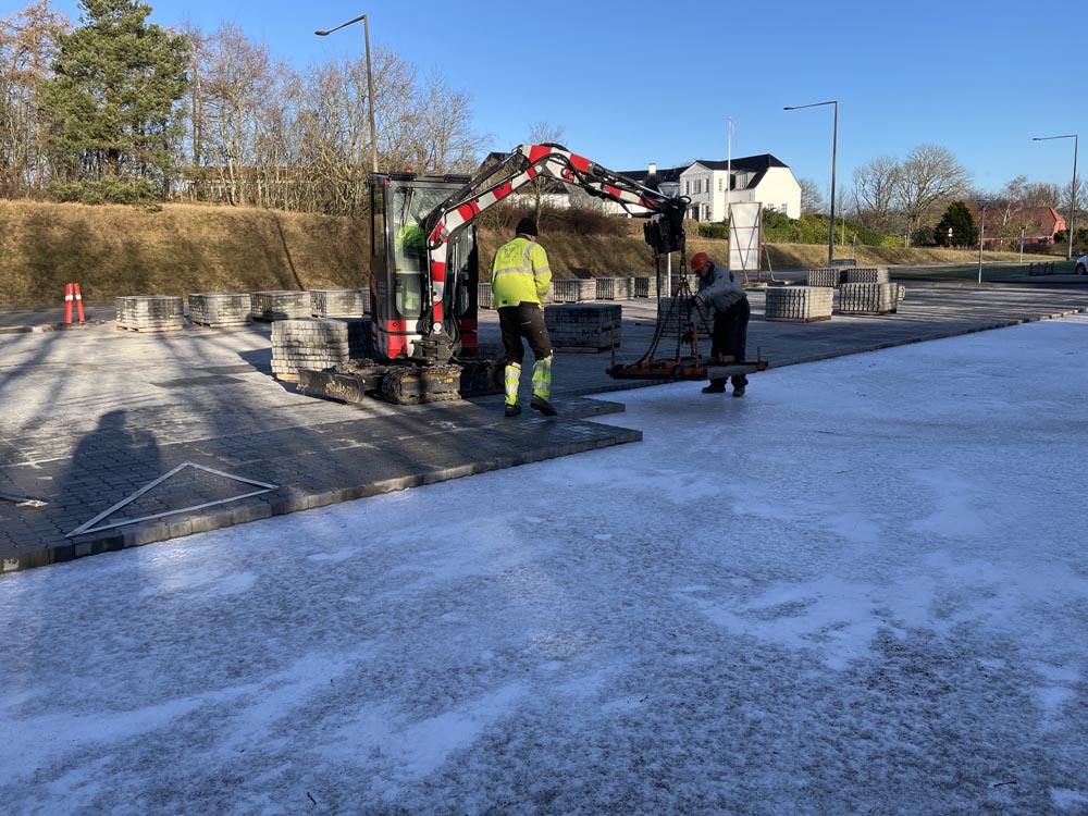 Selv om der har været vejrmæssige og maskinelle udfordinger, bl.a var stenene frosset sammen, er der blevet knoklet på højtryk, for at lave en af de flotteste parkeringspladser i Sæby. Parkeringspladsen er selvfølgelig en den af Sæby Baptistkirke’s nye kirke på Sæbygaardvej i Sæby.